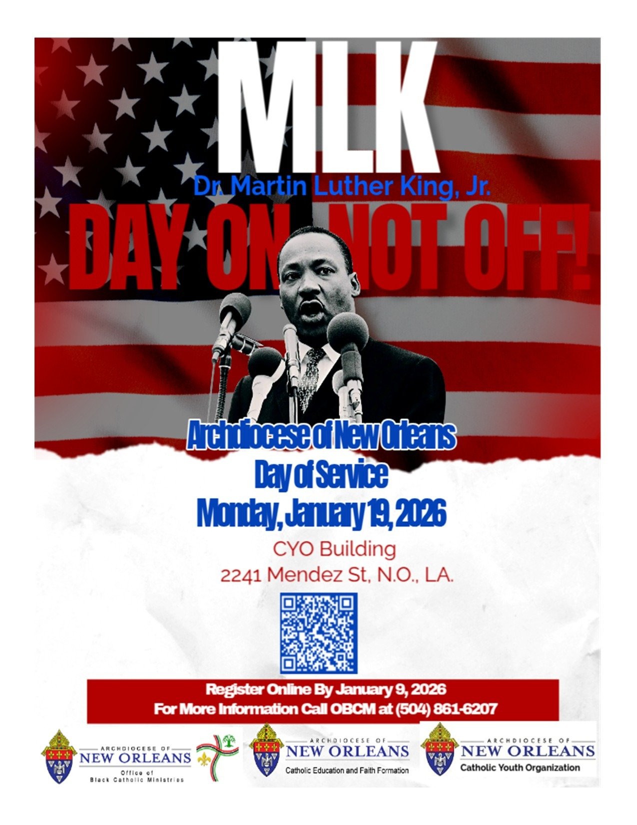 The MLK Day On Not Off is a service day which invites parishes, schools, families, groups, and individuals to make a positive contribution to society in remembrance of the gifts given by Dr. King. Each year participants gather for a prayer service with Archbishop Aymond and then are sent out into the community to serve those who are in need. Projects range from planting in community gardens to serving the homeless at one of our local shelters. Youth who attend must be accompanied by an adult chaperone.