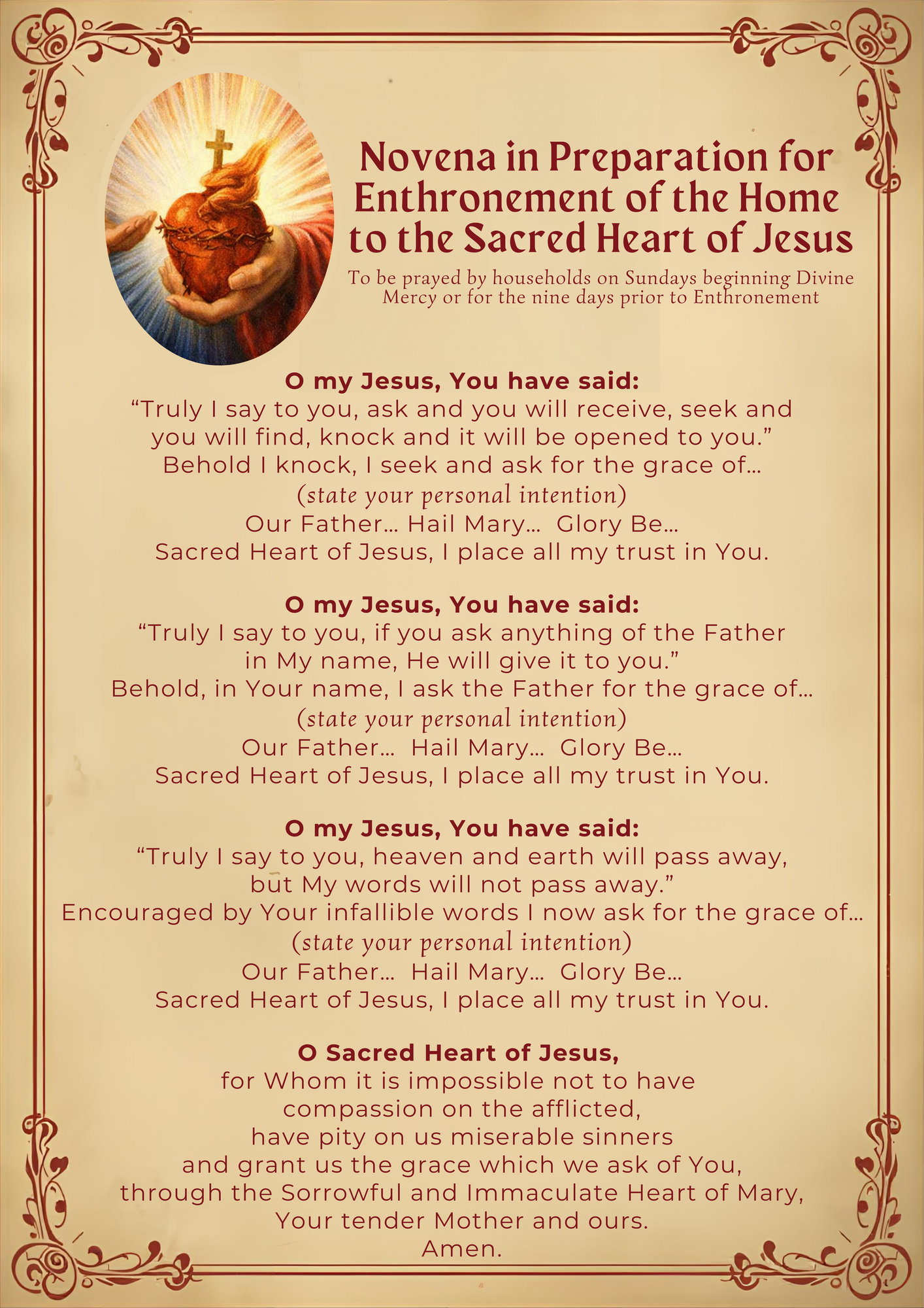 I ask you, therefore, to enter into this time with open hearts, with trust, and with hope. Let us place ourselves confidently under the care of the Sacred Heart, knowing that He will guide us and strengthen us for whatever lies ahead.