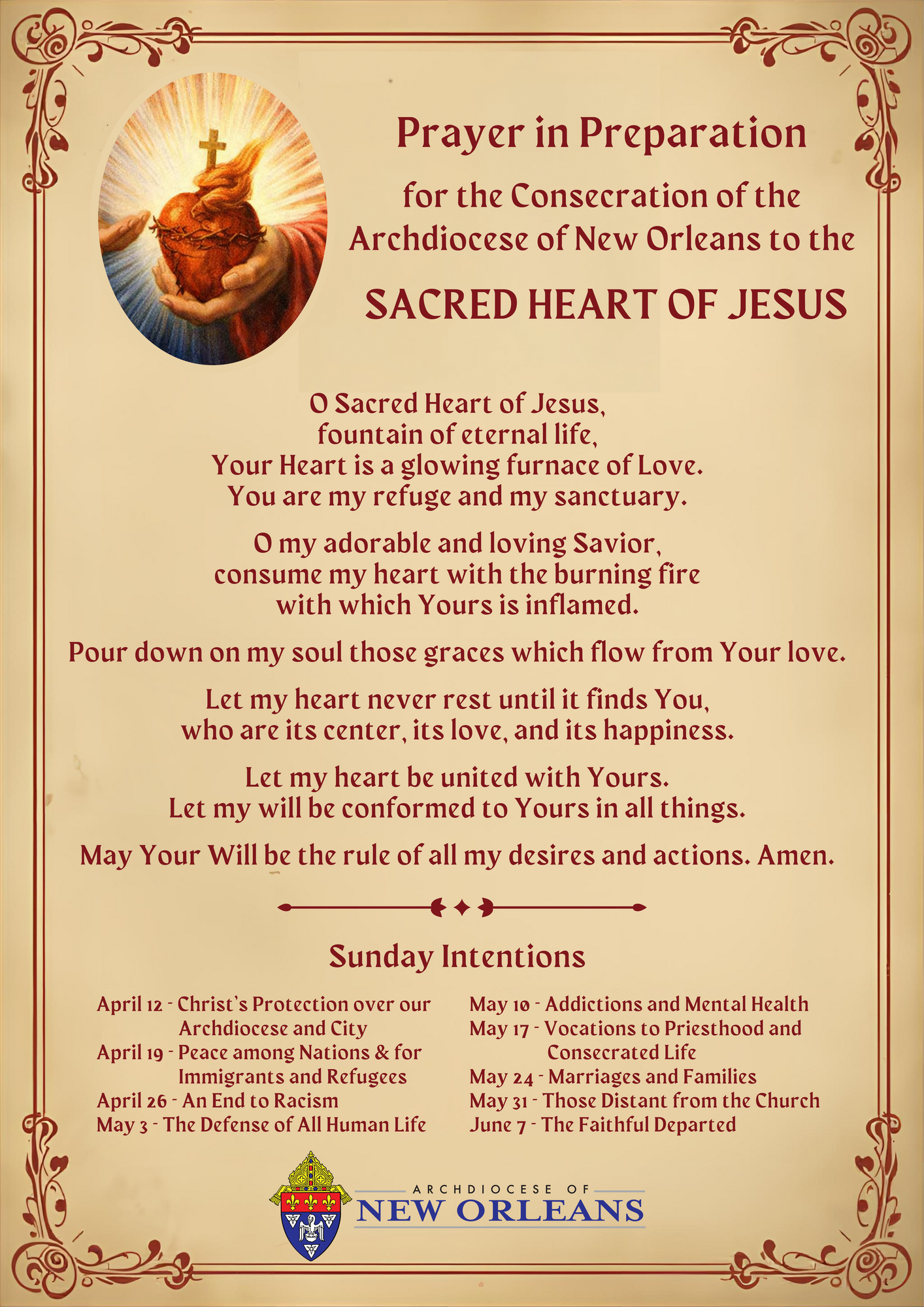 A central part of this initiative will be the invitation for every household to enthrone in their home the Sacred Heart of Jesus on the same day as the Archdiocesan consecration. I strongly encourage you to prepare for this by obtaining a simple 8x10” frame for the image and designating a place of honor for it in your home. These images of the Sacred Heart will be blessed and distributed in every parish of the Archdiocese during Masses on June 13-14. I also encourage each household to prepare spiritually for the enthronement by praying a novena—either on the Sundays leading up to the consecration or during the nine days immediately beforehand. This simple but meaningful act can become a powerful source of grace, reminding us daily of the Lord’s presence and His love for us. Additional materials, prayers, and resources for this time of preparation can be found at nolacatholic.org/sacredheart.